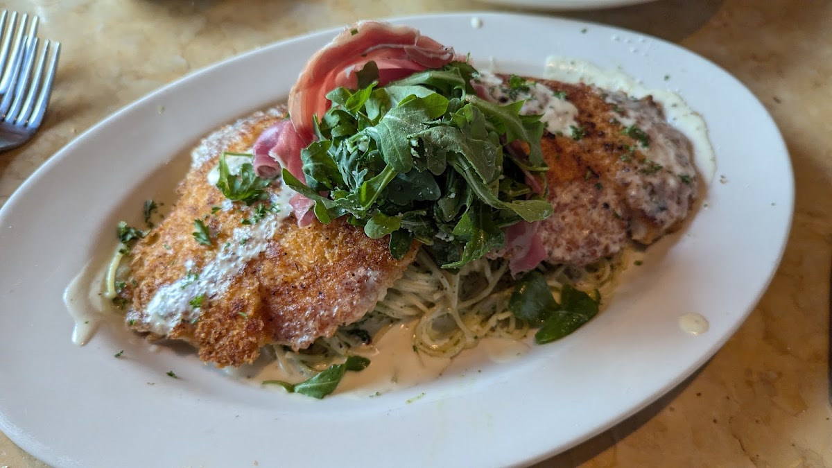 Food was delicious. Service was excellent. Staff is friendly and attentive. Atmosphere is pleasant. I had the Parmesan and herb crusted chicken. Drink is the tropical lemonade.