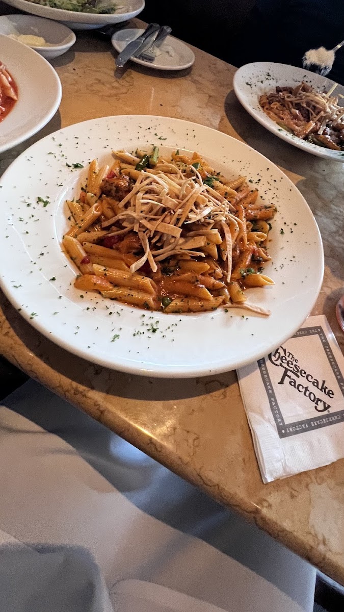Our server Alex was a star! He was full of wonderful facts about the comprehensive training the Cheesecake Company provides, how all food, including sauces, are made in-house, and how the servers memorize the entire menu. Alex made sure my dietary restrictions were considered when putting in my order. The food itself was excellent and freshly prepared. I loved that their hot teas were Numi brand, a company with sustainable and fair trade practices. The only suggestion I would make is to lower the music level so conversation is easier and people with hearing aids don’t have to adjust their levels. My family will be returning often. Thank you to the excellent hosts, servers, and chefs.